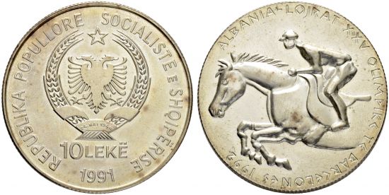 - 1991 10 lekë, Olympic Summer Games, reverse with incuse strike