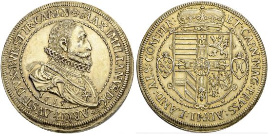 "Heiliges Romisch Reich, Erzherzog Maximilian III. 1612-1618. Doppeltaler 1614, Ensisheim. Sehr schön. Vergoldet. Rand etwas bearbeitet. (Holy Roman Empire, Austria, archduke Maximilian III, 1612-18, double thaler of 1614, Ensisheim int. Very fine, Gilded, Edge slightly tooled.)"