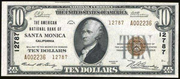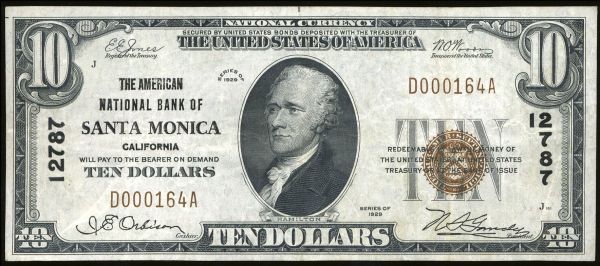 This specimen was lot 18289 in Heritage auction 354 (the Horwedel sale, Long Beach, CA, September 2004), where it sold for $690. The catalog description[1] noted, "Santa Monica, CA - $10 1929 Ty. 2 The American NB Ch. # 12787. A barely circulated Extremely Fine example."