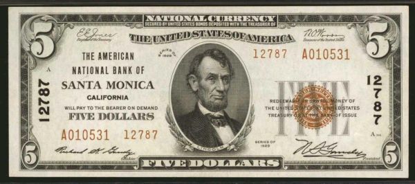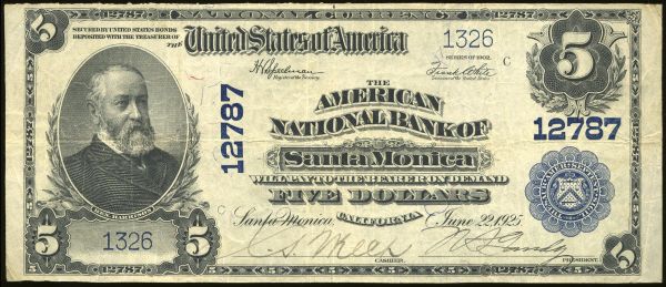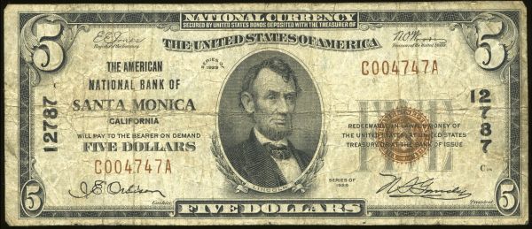This specimen was lot 18285 in Heritage auction 354 (the Horwedel sale, Long Beach, CA, September 2004), where it sold for $431.25. The catalog description[1] noted, "Santa Monica, CA - $5 1929 Ty. 1 The American NB Ch. # 12787. For some reason, Type one small examples are almost impossible to obtain from here, with only three of the 31 pieces reported to date fitting that description. This is one of just two fives, which, incidentally, bears the first type style used by the bank. Very Good."