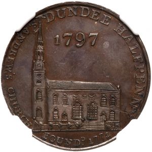 This specimen was lot 2297 in Goldberg sale 115 (Los Angeles, February 2020), where it sold for $145. The catalog description[1] noted, "Scotland - Angusshire. Halfpenny, 1797. Dundee. Edge: Payable at Warehouse. St. Andrew's Church. NGC graded Brown MS-63 Brown Prooflike."