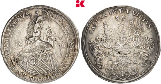 "DEUTSCHE MÜNZEN UND MEDAILLEN · ANHALT-BERNBURG, FÜRSTENTUM, SEIT 1806 HERZOGTUM Christian II., 1630-1656. Reichstaler 1636. R Kl. Schrötlingsfehler, sehr schön. (Germany, principality of Anhalt-Bernburg, Christian II, 1630-56, thaler of 1636. Small planchet flaws, very fine.)"