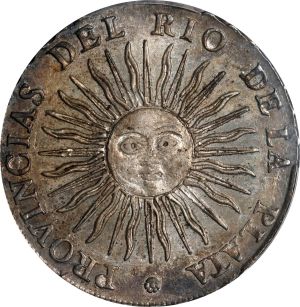 This specimen was lot 34002 in Stack's Bowers ANA sale (Chicago, August 2022), where it sold for $4,320. The catalog description[1] noted, "ARGENTINA. 4 Reales, 1815-PTS F. Potosi Mint. PCGS AU-58. Mintage: 26,588; inclusive of the 4 Soles issues of the same date. Tied for finest certified of the date with two other examples on the PCGS population report, none finer. This beautifully preserved example displays lovely mottled patina with richer coloration in the peripheries and gleaming underlying luster on the obverse. This gently handled survivor exhibits signs of handling primarily contained to the exposed areas of the reverse and high points that you would expect for the graded designation. Pleasing to the eye and quite a bit nicer than normally encountered, this piece is sure to excite many quality conscious collectors. From the Pat Johnson Collection." After General Belgrano captured the villa of Potosí, the general assembly in Buenos Aires issued a law authorizing the minting of the first Argentinian coins on April 13, 1813 in silver and gold. Striking continued until November of the same year when the villa of Potosí was recaptured by forces loyal to the Spanish crown. The mint was reoccupied by General Rondeau and the similar designs previously mentioned were struck in 1815 from April to November, when the Spanish forces once again retook the villa of Potosí. The designs from 1826 to 1837 were minted in the province of Rioja.