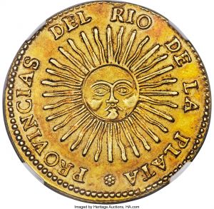 This specimen was lot 30382 in Heritage sale 3073 (Chicago, April 2019), where it sold for $14,400. The catalog description[1] noted, "Rio de la Plata gold 8 Escudos 1833 RA-P AU55 NGC, Rioja mint. Hailing from the highly demanded "Sun-Face" series, this example exudes a quality of preservation and eye appeal rarely seen with any gold issues of this period, much less this specific type, which is rarely offered to collectors. The strike is uniform across each face, with a particular boldness of strike on the obverse, that surface marked by delightful touches of orange and red within the sun's rays. An important type for collectors of South American coinage and an offering that would be difficult to improve upon visually." This type was struck 1826-35 and is expensive.