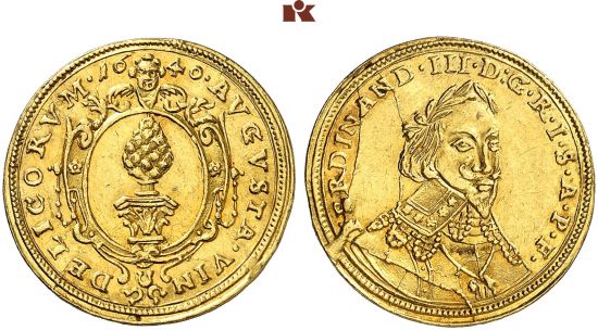 "AUGSBURG, STADT, Dukat 1640, mit Titel Ferdinands III. GOLD. Min. gewellt, Stempelfehler, fast vorzüglich. (Germany, city of Augsburg, ducat of 1640, in the name of Ferdinand III. Slightly bent, die breaks, about extremely fine.)"