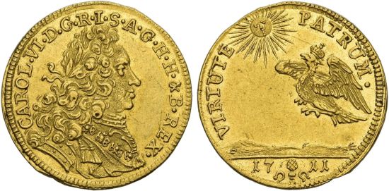 In 1711, the city issued this rare ducat to celebrate the coronation of Charles VI. Other ducats of 1711 include KM 121/Fr-83 (Joseph I) and KM 123/Fr-85 (Charles VI, pine cone reverse).