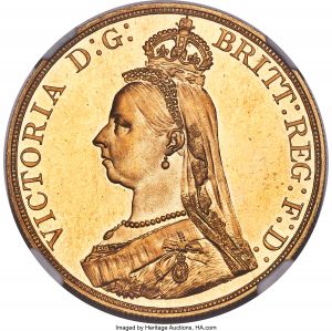 "Australia: Fantastically Rare Sydney 5 Pounds - One of Two in Private Hands. Victoria gold Proof 5 Pounds 1887-S PR64 Cameo NGC, Sydney mint. Reeded edge. Rarely is the acquisition of a coin a truly once-in-a-lifetime opportunity, though with the presentation of this ultra-rarity--the 1887 Sydney 5 Pounds--that may very well be the case. Previously offered in David Akers' sale of the John Jay Pittman Collection of World Coins in August of 1999, this very example was postulated to be one of only two held in private hands--an observation which still appears true, as no other examples have come to market since.