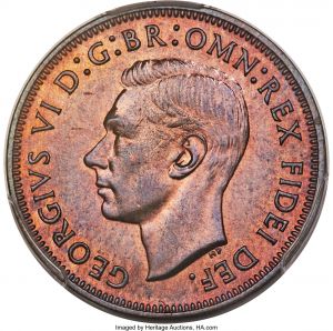 This specimen was lot 30404 in Heritage sale 3073 (Chicago, April 2019), where it sold for $5,280. The catalog description[1] noted, "George VI Proof 1/2 Penny 1951-PL PR65+ Red and Brown PCGS. Very rare, and presently the single-highest certified example with the next best, a pair of MS64 RBs at PCGS. Complete with squared rims, an exemplary strike, and subdued luster. The "PL" mintmark, taken from Roman issues last made in London in the fourth century (Percussa Londinensis) was used to designated the issues struck for Australia in 1951 in the UK. The Deputy Master of the Melbourne Mint, Mr. O.G. Reynolds, spent some weeks in London during 1951, and this was, most likely, the reason for the striking of a small number of Proofs. For reference, we sold a 4-piece partial 1951-PL Proof Set in 2015 (lot 32110) for $42,000 hammer, with the 1/2 Penny therein graded MS64 RB by PCGS." The SCWC does not record why proofs are so rare for this date, which is otherwise common. The type was issued 1949-52 from Perth and London.