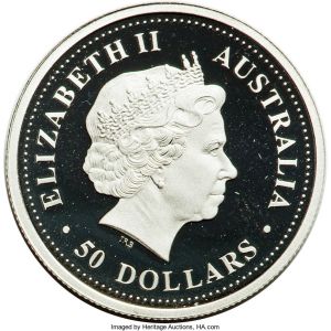 This specimen was part of lot 32390 in Heritage sale 3073 (Chicago, April 2019), which sold for $2,400. The catalog description[1] noted, "Elizabeth II 5-Piece Uncertified platinum 'Discover Australia - Flora' 50 Dollars (1/2 oz.) Proof Set 2006, 1) 'Sturt's Desert Rose' 50 Dollars, KM 983; 2) 'Royal Bluebell' 50 Dollars, KM 985; 3) 'Red & Green Kangaroo Paw' 50 Dollars, KM 987; 4) 'Common Pink Heath' 50 Dollars, KM 989; 5) 'Cooktown Orchid' 50 Dollars, KM 981. Comes with original wooden case and COA #32. Total APW 2.5 oz." Since 1989, Australia has entered the bullion and collectibles market in a big way, having produced commemoratives and NCLT's numbering in the hundreds of types. This series honoring Australian flowers ran in very limited numbers 2006-08.