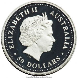 This specimen was part of lot 32392 in Heritage sale 3073 (Chicago, April 2019), which sold for $2,280. The catalog description[1] noted, "Elizabeth II 5-Piece Uncertified platinum 'Discover Australia - Flora' 50 Dollars (1/2 oz.) Proof Set 2008, 1) 'Small Leaf Lillypilly' 50 Dollars, KM 1210; 2) 'Black-Anther Flax-Lily' 50 Dollars, KM 1206; 3) 'Red Flowered Kurrajong' 50 Dollars, KM 1209; 4) 'Native Frangipani' 50 Dollars, KM 1207; 5) 'Geraldton Wax' 50 Dollars, KM 1208. Comes with wooden case of issue and COA #32. APW 2.5 oz." Since 1989, Australia has entered the bullion and collectibles market in a big way, having produced commemoratives and NCLT's numbering in the hundreds of types. This series honoring Australian flowers ran in very limited numbers 2006-08. Altho produced at the Perth mint, none bear a "P" mintmark.