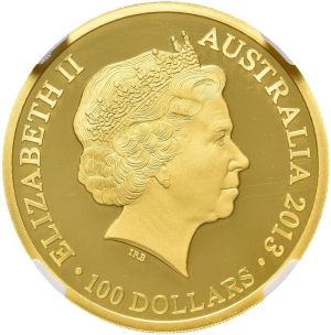 This specimen was lot 289 in Schulman auction 379 (Amsterdam, June 2024), where it sold for €1,800 (about US$2,313 including buyer's fees). The catalog description[1] noted, "Australia - 100 Dollars 2013, Gold, ELIZABETH II 1952-2022 20th Anniversary. Kangaroo. Rev. head to right. NGC PF69 Ultra Cameo." In 2013, this denomination was used to issue KM 1731 (platypus), KM 1837 (year of the snake), 1956 (kangaroo road sign), 1973 (year of the snake), 1983 (koala), 1992 (kangaroo), 2003 (year of the snake), 2024 (kangaroo, shown here), 2048 (koala), 2079 (treasures of Europe), 2084 (kangaroo), 2094 (year of the snake, in color), 2135 (birth of prince George) and 2157 (year of the snake). Most are one ounce gold coins. Lacking photos in the SCWC, identification is tentative.
