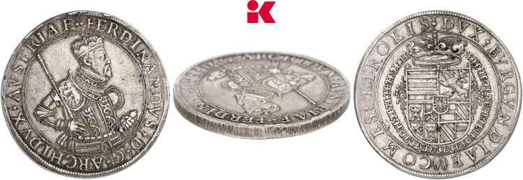 "HABSBURGISCHE ERBLANDE-ÖSTERREICH · RÖMISCH-DEUTSCHES REICH, Erzherzog Ferdinand, 1564-1595. Dicker doppelter Reichstaler o. J. (vor 1594), Hall. Eisenschneider Valentin Koska. Geharnischtes Hüftbild r. mit Erzherzogshut und Löwenkopfschulter, mit der Rechten das Zepter schulternd, die Linke am Schwertgriff//Gekröntes, mehrfeldiges Wappen (Ungarn, Böhmen / Kastilien und León / Österreich und Burgund), mit Mittelschild (Tirol), umher die Kette des Ordens vom Goldenen Vlies. Von großer Seltenheit. Sehr schön-vorzüglich. Exemplar der Auktion Dorotheum 462, Wien 1992, Nr. 858. (Holy Roman Empire, archduke Ferdinand, 1564-95, undated thick double thaler, Hall mint. Obverse: Armored and capped half length bust with scepter and sword and lion's head on shoulder; reverse: crowned manifold arms of Hungary, Bohemia, Castile, Leon, Austria and Burgundy with the escutcheon of Tyrol, Order chain around. Extremely rare, very fine to extremely fine.)"