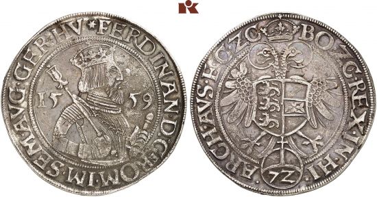 "RÖMISCH-DEUTSCHES REICH. Ferdinand I. 1522-1558-1564. Reichsguldiner (72 Kreuzer) 1559, Klagenfurt. Kl. Korrosionsstellen, sehr schön. (Holy Roman Empire, Ferdinand I, 1558-64, guldiner of 72 kreuzer of 1559, Klagenfurt mint. Some areas of corrosion, very fine.)"