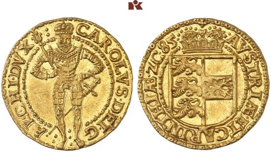 "RÖMISCH-DEUTSCHES REICH, Erzherzog Karl, 1564-1590. Dukat 1585, Klagenfurt. GOLD. Vorzüglich +. (Holy Roman Empire, archduke Charles, 1564-90, ducat of 1585, Klagenfurt mint. Extremely fine or better.)"