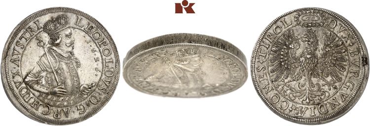 "RÖMISCH-DEUTSCHES REICH, Erzherzog Leopold V. 1619-1632. Dicker dreifacher Reichstaler 1626, Hall. Gekröntes und geharnischtes Hüftbild r. mit der Rechten das Zepter schulternd, die Linke am Schwertgriff//Tiroler Adler mit Ehrenkränzchen. RR Feine Patina, kl. Schrötlingsfehler am Rand, fast vorzüglich. (Holy Roman Empire, archduke Leopold V, 1619-32, triple thaler of 1626, Hall mint. Obverse: crowned and armored half-length portrait of the archduke with sword and scepter; reverse: Tyrolean eagle with wreath of honor. Very rare, edge defects, about extremely fine.)"