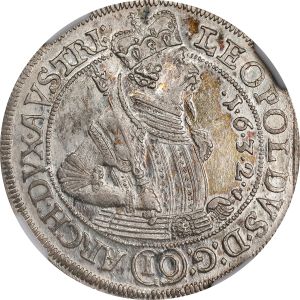 This specimen was lot 55480 in Stack's Bowers NYINC sale (New York, January 2024), where it sold for $192. The catalog description[1] noted, "AUSTRIA. Holy Roman Empire. 10 Kreuzer, 1632. Hall Mint. Archduke Leopold V. NGC MS-61." The SCWC lists this as a one year type with a low catalog value. An earlier version (KM 589.1) was struck 1625-30. Ten kreuzer was one-sixth gulden or one-ninth thaler. Archduke Leopold never became emperor.