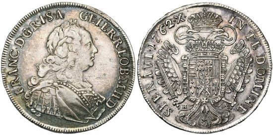 This half thaler was struck for Francis I 1751-65 at Vienna, Hall (shown here), Kremnitz, Karlsburg and Graz. Similar half thalers were struck with the bust of Maria Theresia.