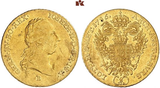 "RÖMISCH-DEUTSCHES REICH, Josef II. 1765-1790. 2 Dukaten 1786, B, Kremnitz. GOLD. Sehr schön. (Holy Roman Empire, Joseph II, 1765-90, double ducat of 1786, Kremnitz mint. Very fine.)"