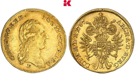 "HABSBURGISCHE ERBLANDE-ÖSTERREICH · RÖMISCH-DEUTSCHES REICH, Joseph II., 1765-1790. Dukat 1787 F, Hall. Büste r. mit Lorbeerkranz, darunter die Münzstättensignatur F//Gekrönter Doppeladler mit Kopfscheinen und Schwert und Zepter in den Fängen, auf der Brust gekröntes, zweifeldiges Wappen (Österreich-Lothringen), umher die Kette des Ordens vom Goldenen Vlies. GOLD. Sehr schön/vorzüglich. Exemplar der Auktion H. D. Rauch 26, Wien 1980, Nr. 1723. (Holy Roman Empire, Joseph II, 1765-90, ducat of 1787, Hall mint. Obverse: laureate bust right, mintmark below; reverse: crowned and nimbate double headed eagle with sword and scepter in its claws, supporting the crowned impaled arms of Austria and Lorraine, order chain around. Very fine to extremely fine.)"