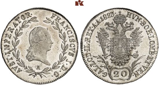 This type was struck 1817-24 at seven mints, including Vienna (A, shown here), Kremnitz (B), Prague (C), Karlsburg (E), Günzburg (G), Milan (M) and Venice (V). The last 20 kreuzer was struck in 1872.