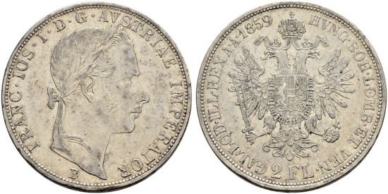 "UNGARN. Franz Joseph I. 1848-1916 Doppelgulden 1859. B Kremnitz. Sehr schön-vorzüglich. (kingdom of Hungary, Francis Joseph I, 1848-1916, double gulden of 1859, Kremnitz mint. Very fine-extremely fine.)"
