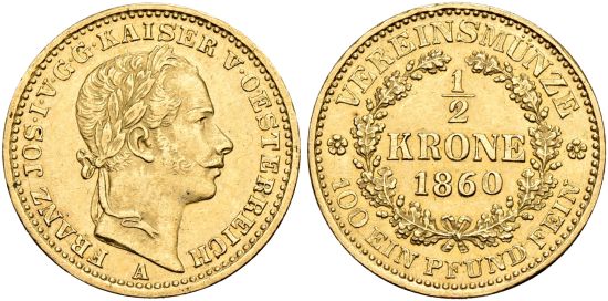 This specimen was lot 3179 in Sincona sale 80 (Zürich, October 2022), where it sold for 2,600 CHF (about US$3,116 including buyer's fees). The catalog description[1] noted, "HOLY ROMAN EMPIRE - AUSTRIA, Franz Joseph I. 1848-1916. 1/2 Vereinskrone 1860 A, Wien. Rare. About extremely fine." The krone was minted by Austria (Fr-496), Saxony (KM 1197), Hannover (KM 232), Prussia (Fr-2437) and Bavaria (Fr-280) but does not seem to have been a success, as survivors are few. This issue, minted 1858-65 at Vienna, Kremnitz, Venice and Karlsburg, seems to be somewhat available.The emperor's bust has heavier whiskers than the previous KM 2251. The Austrians dropped the krone after 1866.