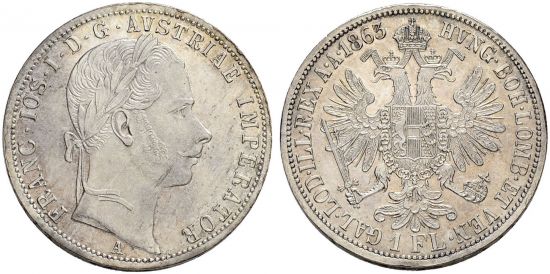 "Franz Joseph I. 1848-1916 Gulden 1863 A. Wien. Vorzüglich-FDC. (empire of Austria, Francis Joseph I, 1848-1916, gulden of 1863, Vienna mint. Extremely fine-uncirculated.)"