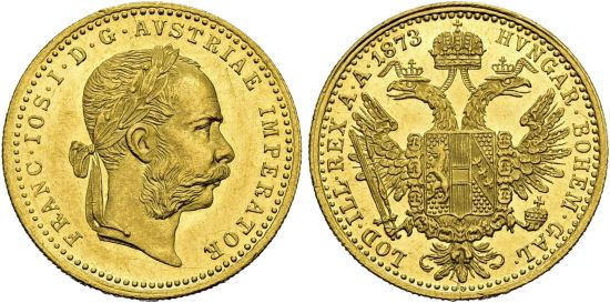 "RDR / ÖSTERREICH, Franz Joseph I. 1848-1916. Dukat 1873, Wien. Gutes vorzüglich. Winzige Kratzer. (empire of Austria, Francis Joseph I, 1848-1916, ducat of 1873, Vienna mint. Good extremely fine, Tiny scratches.)"