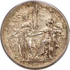 This specimen was lot 29330 in Heritage sale 3042 (Long Beach, September 2015), where it sold for $2,585. The catalog description[1] noted, "Franz Joseph I 2 Florin 1880 MS65 PCGS. Struck to commemorate the First Federal Shooting Festival with lightly-patinated surfaces accented by iridescent hues of turquoise and amber residing within the reverse motifs. Intricately-designed and with undeniable eye-appeal, endlessly collectible at this Gem level of preservation." Davenports lists this item as a coin but the SCWC relegates it to their "Unusual World Coins" volume. Earlier two florin pieces were struck 1859-72. Two florins nominally equalled a thaler but the old thalers (1751-1852) were 28.06 g, 0.833 fine while later thalers (1857-68) were 18.51 g, 0.900 fine silver. In 1892, the currency was reformed again so that 100 heller = 1 corona. The system collapsed with the regime in the throes of World War One.