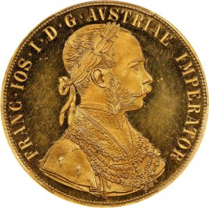 This specimen was lot 42020 in Stack's Bowers ANA sale (Oklahoma City, OK, August 2025), where it sold for $8,400. The catalog description[1] noted, "AUSTRIA. 4 Ducats, 1880. Vienna Mint. Franz Joseph I. PCGS MS-62 Prooflike. A RARE original striking of a type often encountered as a restrike, this nearly-Choice specimen glistens with an abundance of alluring brilliance in the fields and frosting imparted unto the devices, the sum of which is a captivating cameo-like nature." This type was struck 1872-1915 in substantial numbers but the 1915 restrike is most commonly seen.