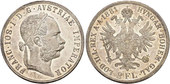 "HOLY ROMAN EMPIRE - AUSTRIA. Franz Joseph I. 1848-1916. 2 Gulden 1881, Wien. NGC MS65. Prachtexemplar. (empire of Austria, Francis Joseph I, 1848-1916, double gulden of 1881, Vienna mint. Uncirculated, Cabinet piece.)"