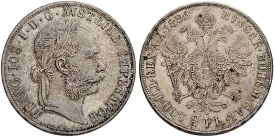 "Franz Joseph I. 1848-1916 Doppelgulden 1886. Wien. Vorzüglich-FDC. (empire of Austria, Francis Joseph I, 1848-1916, double gulden of 1886, Vienna mint. Extremely fine-uncirculated.)"