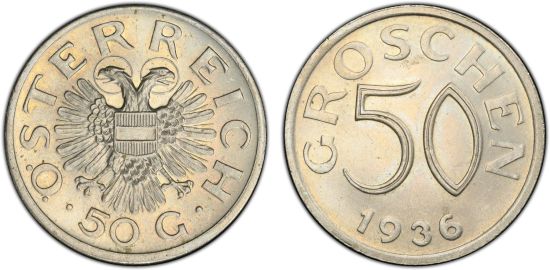 This specimen was lot 820 in Steve Album Auction 52 (Santa Rosa, CA, May 2025), where it sold for $156. The catalog description[1] noted, "AUSTRIA: Republic, 50 groschen, 1936, scarce key date, a superb lustrous mint state example! PCGS graded MS65." In 1925, the currency was reformed with 100 kronen (old) = one groschen (new) and 100 groschen = one schilling. This type was struck 1935-36, a few years before the anschluss with Nazi Germany.