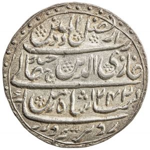 This specimen was lot 1155 in Stephen Album sale 37 (Santa Rosa, CA, June 2020), where it sold for $226.10. The catalog description[1] noted, "AWADH: Ghazi-ud-Din Haidar, 1819-1827, AR rupee Lucknow, AH1242 year 8, mint formula dar al-saltanat suba awadh, choice EF to AU." This type was struck years 2-9. Per Wikipedia, "Ghazi-ud-Din Haidar Shah (Hindi: ग़ाज़िउद्दीन हैदर शाह Urdu:غازی الدیں حیدر شاہ) (b. c. 1769 – d. 19 October 1827) was the last nawab wazir of Oudh from 11 July 1814 to 19 October 1818 and first King of Oudh (Oudh State) from 19 October 1818 to 19 October 1827." Ghazi ud-Din Haidar promoted himself from nawab to king with British connivance, setting aside the nominal suzerainty of the Mogul emperor. Later, a succession dispute resulted in British intervention and overlordship. Resentment of this and other acts led to the Indian Mutiny of 1857, which was centered at Awadh's capital Lucknow.
