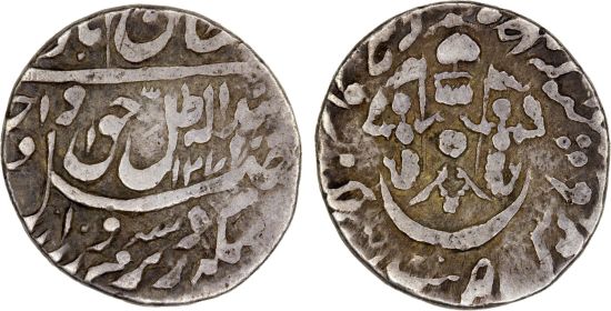 The first specimen was lot 667 in Steve Album Auction 51 (Santa Rosa, CA, January 2025), where it sold for $720. The catalog description[1] noted, "AWADH: Wajid Ali Shah, 1847-1856, AR 1/8 rupee, Lucknow, AH1271 year 9, NGC graded AU55, R." The second specimen was lot 2633 in the same sale, where it sold for $108. The catalog description[1] noted, "AWADH: Wajid Ali Shah, 1847-1856, AR 1/8 rupee Lucknow, AH1271 year 9, Fine." This product of the Lucknow mint is listed for AH 1264-1268. In 1818, Ghazi ud-Din Haidar promoted himself from nawab to king with British connivance, setting aside the nominal suzerainty of the Mogul emperor. Nasir-ud-Din Haidar was king 1827-37. His death caused in a succession dispute which resulted in British intervention and overlordship. Resentment of this and other acts led to the Indian Mutiny of 1857, which was centered at Awadh's capital Lucknow.