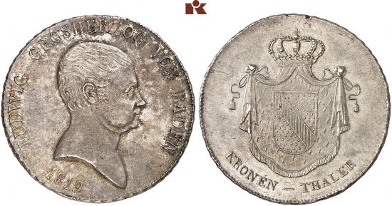 "BADEN, BADEN-DURLACH, MARKGRAFSCHAFT, SEIT 1806 Grossherzogtum, Ludwig, 1818-1830. Kronentaler 1819. Mit Signatur "DOELL" am Halsabschnitt. Kräftige Patina, vorzüglich-Stempelglanz. (Germany, grand duchy of Baden, Louis, 1818-30, crown thaler of 1819, with signature on the truncation of the bust. Strongly toned, extremely fine to uncirculated.)"
