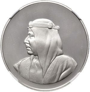 This specimen was lot 291 in Schulman auction 379 (Amsterdam, June 2024), where it sold for €70 (about US$90 including buyer's fees). The catalog description[1] noted, "Bahrain - 5 Dinars AH1410//1990, Silver Save the Children. Footballing children. Rev. bust of Isa b. Salman left. NGC PF68 Ultra Cameo."