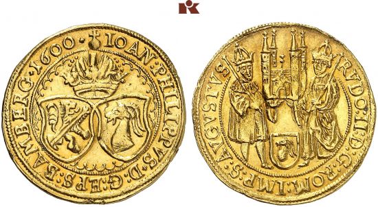 "BAMBERG, BISTUM, Johann Philipp von Gebsattel, 1599-1609. Dukat 1600, Nürnberg. Krone über den Wappenschilden von Bamberg und Gebsattel//Gekrönter Kaiser Heinrich II. und Kaiserin Kunigunde halten Modell der Domkirche, unten kleiner Wappenschild von Gebsattel. GOLD. Von großer Seltenheit. Winz. Randfehler, fast vorzüglich. (Germany, bishopric of Bamberg, John Philip of Gebsattel, 1599-1609, ducat of 1600, Nuremberg mint. Obverse: crowned arms of Bamberg and Gebsattel; reverse: crowned emperor Henry II and empress Kunigunde hold a model of the cathedral, small shield below. Very rare, rim defects, about extremely fine.)"