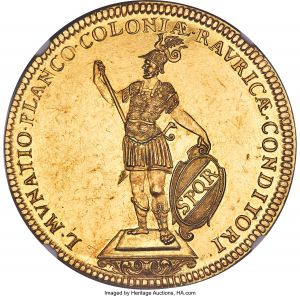 This type is not listed in the SCWC or HMZ because it is a medal, along with the similar twelve, eight ducats and six ducats. We include it here because it is mentioned in Friedberg.