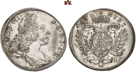 On the death of emperor Charles VI in 1740, the elector of Bavaria made a bid for the imperial throne with French and Prussian support, launching the War of the Austrian Succession. Frederick the Great of Prussia used it as a pretext to invade and annex Silesia. Eventually, the Austrian army occupied and devastated Bavaria, forcing the elector into exile and surrendering his claim to Francis of Lorraine, who married Maria Theresia. This six kreuzer was struck 1742-45.