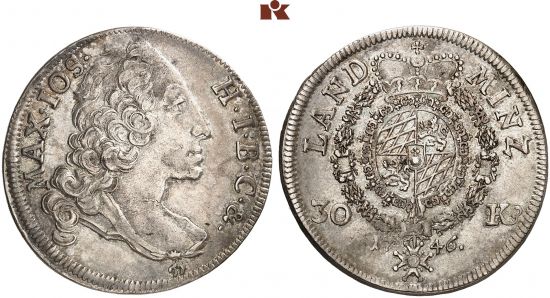 "BAYERN, HERZOGTUM, SEIT 1623 KURFÜRSTENTUM, SEIT 1806 KÖNIGREICH: Maximilian III. Joseph, 1745-1777. 30 Kreuzer (1/2 Gulden) 1746, München. R Vorzüglich. (Germany, electorate of Bavaria, Maximilian III Joseph, 1745-77, thirty kreuzer or half gulden of 1746, Munich mint. Rare, extremely fine.)"