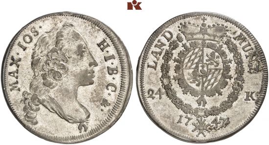 "BAYERN, HERZOGTUM, SEIT 1623 KURFÜRSTENTUM, SEIT 1806 KÖNIGREICH: Maximilian III. Joseph, 1745-1777. 24 Kreuzer (Sechsbätzner) 1747, München. Sehr selten, besonders in dieser Erhaltung. Feine Patina, fast vorzüglich. (Germany, electorate of Bavaria, Maximilian III Joseph, 1745-77, 24 kreuzer or six batzen of 1747, Munich mint. Very rare, especially in this quality. Fine patina, about extremely fine.)"