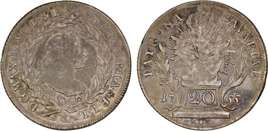 This specimen was lot 2905 in Steve Album Auction 51 (Santa Rosa, CA, January 2025), where it did not sell. The catalog description[1] noted, "BAVARIA: Maximilian III Josef, 1745-1777, AR 20 kreuzer, 1755, Madonna and Child, details a bit weak, toned, VF-XF." This type was struck 1753-58 and 1763. One convention thaler was 120 kreuzer.