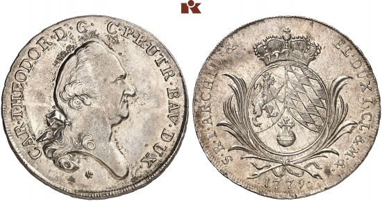 "BAYERN, HERZOGTUM, SEIT 1623 KURFÜRSTENTUM, SEIT 1806 KÖNIGREICH: Karl Theodor, 1777-1799. 1/2 Konv.-Taler 1779, München. Variante mit Rosette unter dem Kopf. Feine Tönung, vorzüglich. (Germany, electorate of Bavaria, Charles Theodore, 1777-99, half convention thaler of 1779, Munich mint, variety with a rosette under the bust. Fine toning, extremely fine.)"