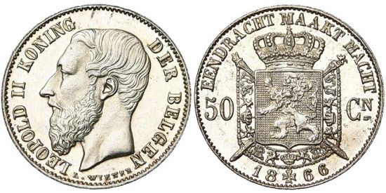 " BELGIQUE, Royaume, Léopold II (1865-1909), 50 centiemen, 1866 NL. Refrappe en argent. Tranche lisse. Petit coup sur la tranche. Fleur de Coin. (kingdom of Belgium, Leopold II, 1865-1909, fifty centimes of 1866, Dutch legends, restrike in silver, plain edge. Minor rim nick, Uncirculated.)"