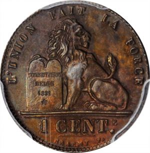 This specimen was lot 72144 in Stack's Bowers Collector's Choice sale (Santa Ana, CA, June 2020), where it sold for $45. The catalog description[1] noted, "BELGIUM. Centime, 1912. PCGS MS-63 Brown Gold Shield. French legend variety. A rather deep brown and choice example, with some shimmering luster peeking through." This type was also struck in 1914 before the start of World War One. This denomination was also struck with Flemish legends (KM 77).