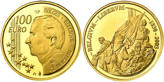"BELGIQUE, Royaume, Albert II (1993-2013), AV 100 euro, 2005. 175e anniversaire de la Belgique. Flan poli. (kingdom of Belgium, Albert II, 1993-2013, gold hundred euro of 2005, 175th anniversary of the kingdom. Proof.)"