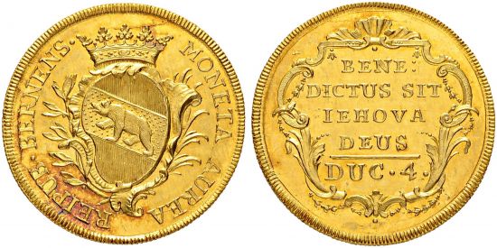 "Bern. 4 Dukaten o. J. (um 1750). Gekröntes Stadtwappen in einem Kranz aus einem Lorbeer- und Palmzweig. Rv. Kartusche mit Inschrift und Wertangabe. Sehr selten. FDC. Prachtvolle Erhaltung. (canton of Bern, undated quadruple ducat. Obverse: crowned city arms between laurel and palm branches; reverse: cartouche with inscription and value. Very rare. Uncirculated. Magnificent condition.)"