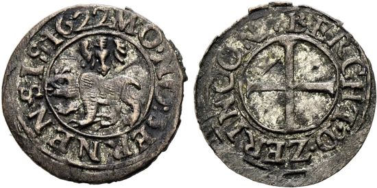 "SCHWEIZ Bern, Stadt und Kanton, Vierer 1622, Bern. Nach links schreitender Bär unter auffliegendem Adler. Rv. Einfaches Ankerkreuz mit Kreiseinfassung. Äusserst selten. Gutes sehr schön. (Switzerland, canton of Bern, vierer of 1622, Bern mint. Obverse: bear walking left under an eagle displayed. Reverse: Simple anchor cross within circular border. Extremely rare, Good Very Fine.)"