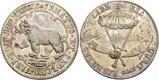 "SWITZERLAND | Bern | Stadt und Kanton. Sechzehnerpfennig 1700, Bern. Nach links schreitender Bär in Sechspass. Rv. Schwert- und Zepterarm unter strahlender Sonne. Ohne Randschrift. Mit Gegenstempel (?). Sehr selten in dieser Erhaltung. Fast FDC. Feine Patina. (Switzerland, canton of Bern, sixteen pfennig of 1700, Bern mint. Obverse: a bear marches left in a hexalobe; reverse: two arms, with a sword and scepter, under a shining sun. No edge lettering. Very rare in this condition, About uncirculated, Nicely toned.)"